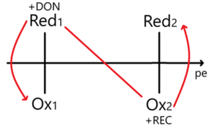 Error al representar (error de sintaxis): {\displaystyle \[ \begin{aligned} \text{Ox}_1 + n_1e^- &\rightleftharpoons \text{Red}_1 \quad E^\circ_1 \\ \text{Ox}_2 + n_2e^- &\rightleftharpoons \text{Red}_2 \quad E^\circ_2 \end{aligned} \]}
