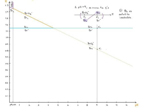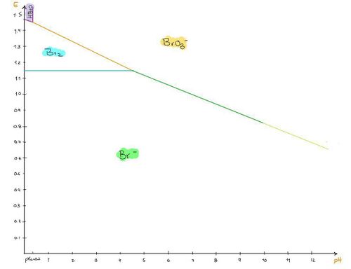 En ocasiones, resulta conveniente realizar diagramas bidimensionales E'=f(pH), también conocidos como diagramas de Pourbaix para analizar el comportamiento y la estabilidad de un sistema de especies químicas en función del pH. Una vez obtenidas las funciones de potencial normal condicional para las especies de un sistema, al momento de trazar el diagrama de Pourbaix pueden verse procesos de dismutación para una especie del sistema, lo que genera la formación de un nuevo par que tendrá asociado su potencial normal condicional asociado. A continuación se muestra el trazo de un diagrama de Pourbaix para el sistema de las especies de bromo en función del pH, mostrando el proceso de dismutación del bromo molecular y la formación de un nuevo par redox.